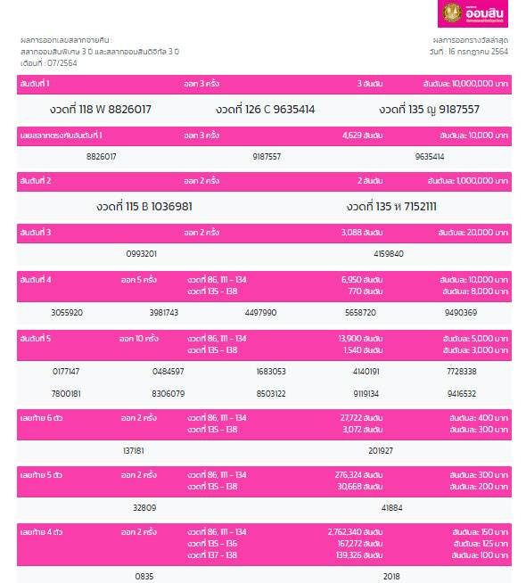 ตรวจหวยงวดวันที่ 16 กรกฎาคม 2564 - 64 รางวัลที่ 1 รางวัลละ 6,000,000 บาท. Jun 16, 2021 · ตรวจหวย งวดวันที่ 1 กรกฎาคม 2564 ตรวจหวย งวดวันที่ 16 มิถุนายน 2564. Jul 16, 2021 · หวยออก ตรวจสลากกินแบ่งรัฐบาล ตรวจหวย งวดวันที่ 16 กรกฎาคม 2564. ตรวจหวย งวดวันที่ 16 กรกฎาคม 2564 social news. ผลสลากกินแบ่ง 16 กรกฎาคม พ.ศ.2564 ตรวจหวย งวดวันที่ 16 ก.ค. Jun 01, 2021 · ตรวจหวย ตรวจผลสลากกินแบ่งรัฐบาล งวดประจำวันที่ 16 กรกฎาคม 2564.